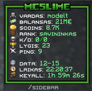 Žinoma, tai yra mūsų pirmasis bandymas, todėl gali pasitaikyti įvairių nesklandumų. Norime jus užtikrinti, kad esame pasiruošę operatyviai spręsti visas iškilusias problemas, jog galėtumėte sklandžiai žaisti mūsų serveryje. Kilus klausimams ar pastebėjus nesklandumus, kviečiame susisiekti per mūsų [https://discord.mcslime.lt Discord] serverį.</blockquote>- Sukurta nauja statistikų ir lyderių [[:Vaizdas:Statistikų svetainė.png|statistikų svetainė]] - https://stats.mcslime.lt<blockquote>[[Vaizdas:TAB.png|miniatiūra|311x311px|Atnaujintas šoninis meniu]]Svetainėje galėsite sekti savo žaidimo progresą, pvz. daugiausiai iškastus ar pastatytus blokus, matyti savo ir kitų žaidėjų pozicijas tam tikrose lyderių lentelėse.</blockquote>- Sukurta serverio žemėlapio svetainė realiuoju laiku - https://map.mcslime.lt